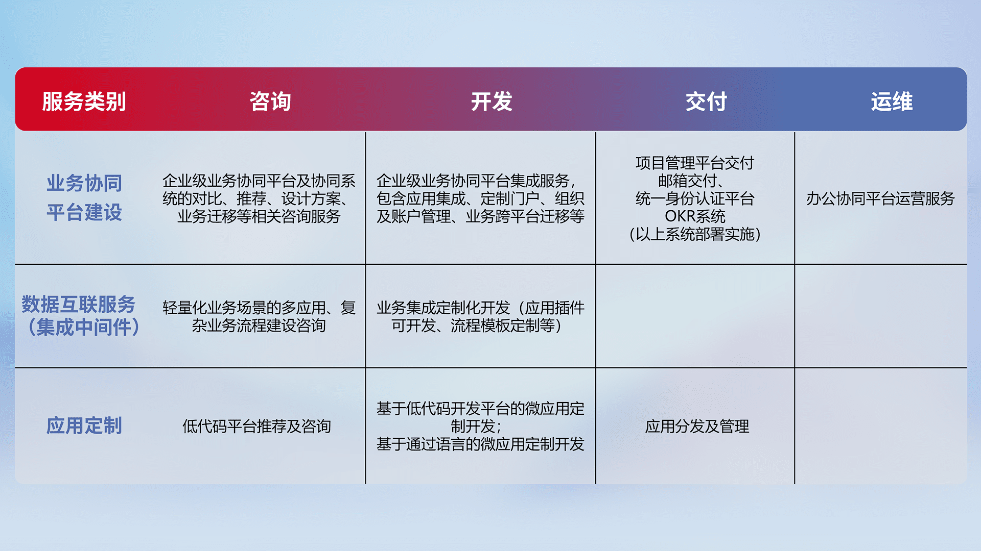针对钉钉、、、、企微、、、、IDaas等平台级产品提供产品的规划、、、方案、、交付、、、、定制化开发等服务,,,,实现如统一协同办公、、、智能客户服务、、混合会议管理、、、智能数据查询、、、等业务场景,,实现数字化转型。。。。